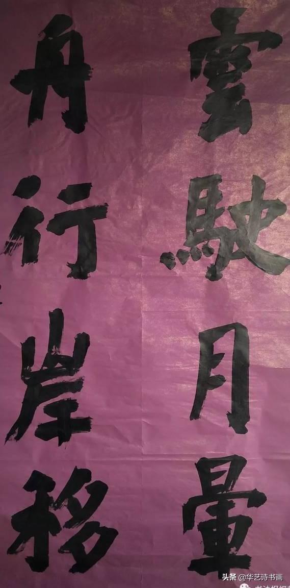恕我把作者名字隐去。你能想象这样的书法能入国展么?可是它就被选上了!秘诀一是字大,二是人家会制做,瞧见没有,紫不溜秋的颜色,这纸你见过没?独一份啊。三是,也许是最关键的,老师是市书协主席。