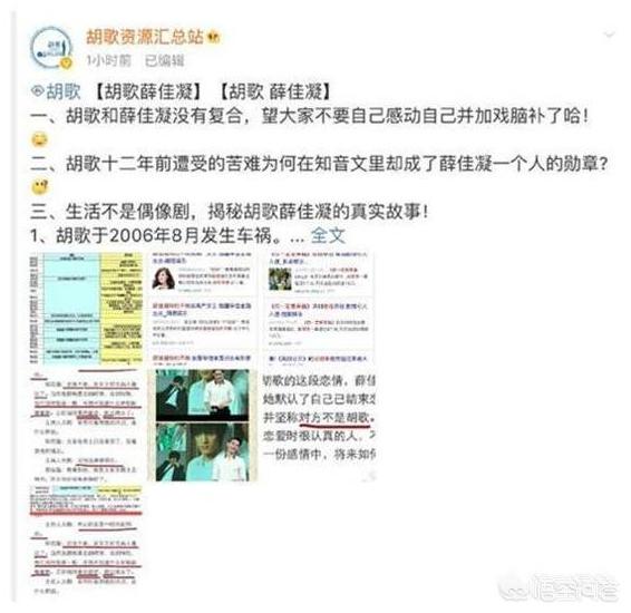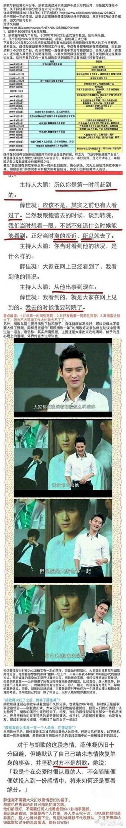 胡歌善良,有演技,有人品。借此我想说【胡歌和薛佳凝的故事不要再被一直神话下去。】网上看到太多造谣胡歌妈妈的文章,我想借此说一说自己听到当事人说的,我所了解到的情况,在《生活启示录》里胡歌演了姐弟恋,当时宣传剧时,胡歌回答记者提问,说我也有过姐弟恋,那时妈妈并没有怎么反对,分手可能是我那时太年轻吧,我给不了她想要的生活,相爱恨早(那时胡歌车祸毁容事业没着落)。 胡歌是在李逍遥后最火时跟薛佳凝恋爱,两人是在2年后胡歌车祸毁容事业最低谷时分手,当时媒体报道称男人没了事业女人离开也是正常的,毕竟薛佳凝被媒体报道称高产女王,被华谊看中去华谊发展。胡歌自己承受车祸后能不能当演员的阴影。 胡歌车祸第二天就转院去香港,薛佳凝第三天就进剧组拍《橱缘》,胡歌一直在香港治疗韩国修复,薛佳凝在内地拍戏上节目,都有据可查。 也可以看看《幸福的拾荒者》里胡歌说自己怎样炖猪蹄,拔猪蹄毛的。 网上一开始都传袁弘停工照顾胡歌,因为胡歌车祸后,射雕剧组都停下来说要等胡歌,当时袁弘是有时间的,但是袁弘及时出来澄清说,胡歌有手有脚,自己能做饭,不需要别人照顾,没网上说的那么夸张,我只是陪他吃吃饭,说说话,看看碟。但是要走出心里阴影的自有靠胡歌自己,没有人能帮助他。胡歌对当时每个帮助过他,鼓励过他的人都心怀感恩。 08年他们分手后,有篇知音文造谣薛佳凝停工照顾胡歌,那时薛佳凝也是否定的,但是多年后,胡歌在15年火爆后,一下子涌出46万多条通稿谩骂胡歌及胡歌妈妈欠薛佳凝一个解释,我是看蒙了,到处造谣薛佳凝停工一整年照顾胡歌,等胡歌恢复好了,胡歌妈妈一句不同意就拆散了他们。这样的剧情从那时一直演到现在,都没有停过,不明真相的网友还攻击胡歌及胡歌妈妈,我不知道这样的剧情怎么有这么多人相信。以胡歌的为人根本不可能会对待这样的女人。胡歌在14年一次朗诵里说过,自己妈妈在自己15岁时因乳腺癌复发动过手术,在今年8月20日畅优活动中也说,妈妈30多年来一直与病痛作斗争,是妈妈的坚强乐观一直鼓励车祸后的胡歌。 在胡歌车祸最低谷时情绪低落,胡歌说妈妈经常身体疼痛都还面带微笑,胡歌以为有什么好事情,结果妈妈对他说,我们都活了下来就是老天最大的恩赐,没有什么比这个更让人开心的事情了。还鼓励胡歌说,以前观众在意的是你的外表,老天现在在你脸上开了一扇窗,是要让大家看到你的内在。多么有智慧,心胸阔达之人,希望网友们不要被人带节奏去诋毁这样一位伟大的妈妈。也请网友们知道,胡歌发脾气发妈妈催婚微博是在2010年12月,跟在08年初就分手的薛佳凝没有半毛钱关系。因为身患重病的妈妈自然希望儿子早点结婚,以防自己不测就看不到儿媳妇或子孙,就算普通父母儿子都快30了,没个女朋友也会着急的吧。请求网友们高抬贵手放过这对经历苦难的人吧。 我还想说说,反观薛佳凝,以前采访时她说,胡歌车祸第二天她跟鲍蕾一起去医院看胡歌,那时胡歌他们正在办理转院手续,我看到的就是大家网上看到的一样,自己跟胡歌分手后也有新恋爱。在后来15年后,记者再问她,她就说我自己一人在心里流浪,又一次记者问胡歌,她说胡歌太火了,不提他,当天这个视频上新浪微博热搜,网友一片好评,中国最佳好前任,可是薛佳凝回去后却又转发了一天网友喊话胡歌跟她复合的微博,后来一次又在微博里发了一张戴有hu字母帽子的照片,还对记者提问感情的事说自己一个人在心里流浪呀。她的种种行为我觉得都是有意让网友们有无限的可能发挥想象力空间。不反对你想复合,但可否跟袁弘一样坦荡荡的澄清一下那些诋毁胡歌及胡歌妈妈的谣言?薛佳凝现在的形象给我感觉就是苦情剧里的苦情女,作为演员还是给观众带些有力度的作品,大家自然就记住你了,苦情剧人设能保持多久?