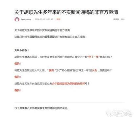 胡歌资源总站已对各种版本的谣言做了澄清:“错过了一个很好的人”是陈鲁豫说的;“落泪”是视频网站意淫的;“停止事业照顾一年”是《知音》杂志写的;“家里人不同意”是人人网小意子谣言变种.....
