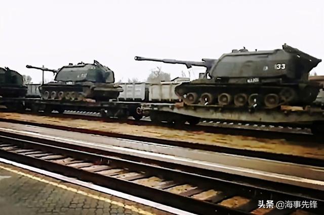 图为俄罗斯军列向前线运送联盟自行火炮。