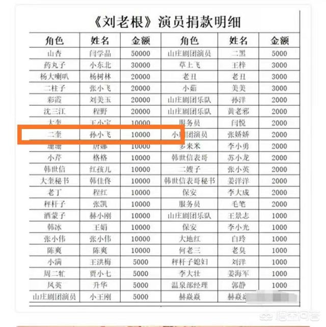 前几天,《刘老根》的拍摄地开原遭遇罕见龙卷风袭击。《刘老根3》和《乡村爱情12》剧组都展开募捐活动,在本山传媒公布的剧组捐款明细中发现,除了师父赵本山捐款500万外,扮演山杏闫学晶的捐款金额排名最靠前,其次是扮演药匣子儿子的药丸子的演员小东北, 而在名单中出现的“刘二奎”的扮演者是孙小飞,郭铁城被取代成既成事实。