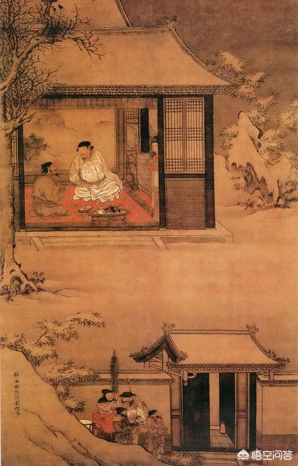 图为明代画家刘俊《雪夜访普图》,描绘了赵匡胤夜访赵普,询问计谋的故事。