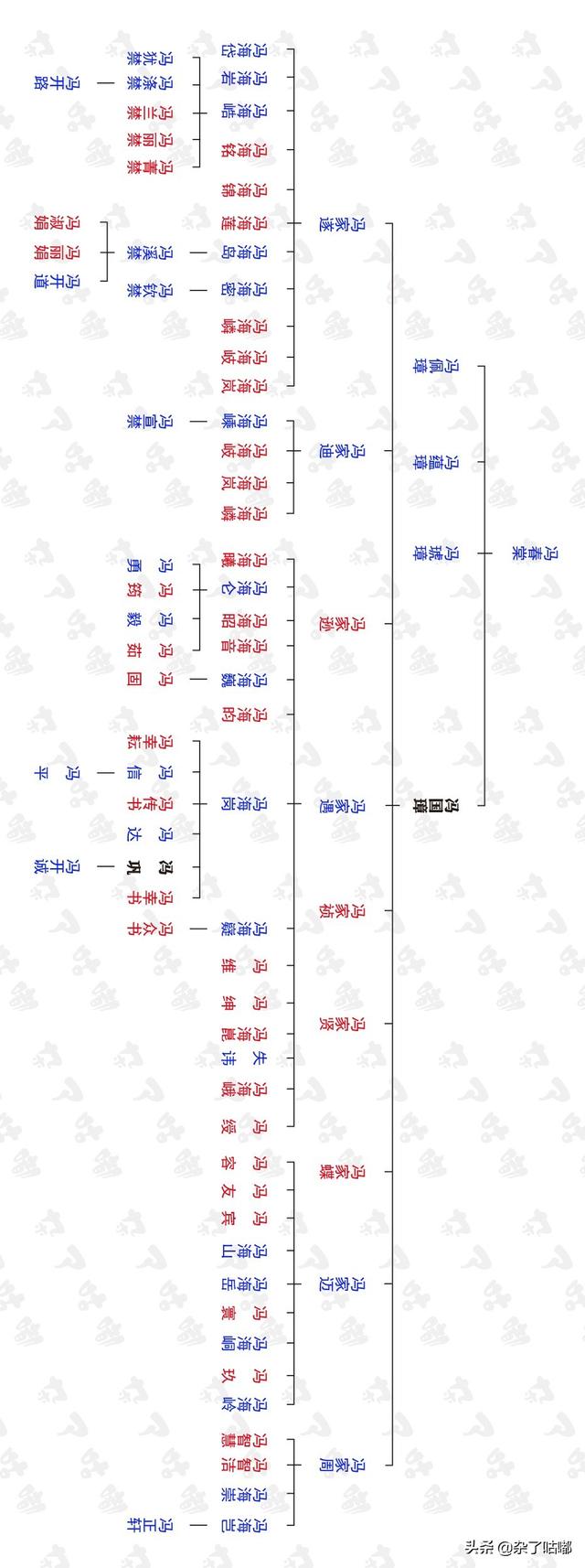 实在不想让大家把手机横过来,可是没办法,竖着传图片就是不清晰,其实才是一个600多K图片,不知怎么弄,只好横过来传了。图片中蓝字是男性,红字是女性,黑字华体是两位主人公冯国璋和冯巩,从图上看很明了,冯国璋是冯巩的曾祖父。