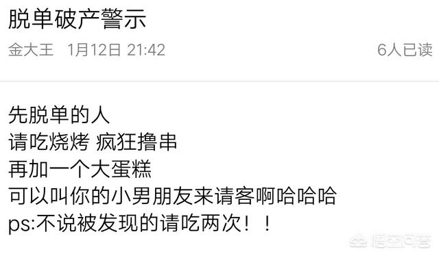 哈哈,这个问题是我最近在经历的一个问题,我们宿舍本来是个单身宿舍,原来的群名叫“单身贵族训练基地”并且还立下了一个规矩:谁先脱单就请全宿舍吃饭。这还没完,我告诉你们要请吃啥啊:自助、烤肉、牛排、烤串、蛋糕、加各种甜品(每个人自己点的)……这个群名可以说留了很长时间啊,然后终于最近有一天,我们宿舍的大哥脱单了(注意:我们是女生,大哥是我们宿舍最大的那个)。现在正在悲哀的攒钱,等待我们狠狠地宰一顿。