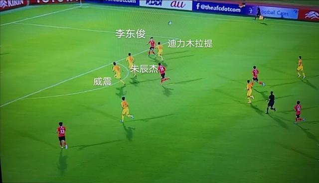 韩国金镇圭40多米的过顶长传球,准确的找到了11号李东俊。20号迪力木拉提没有第一时间防守住李东俊,并被甩在身后,迪力木拉提对李东俊的防守处于被动,单靠他的防守肯定面临被进球的危险。这个时候还有最后一次补救机会。5号朱辰杰和4号威震身后只有一名韩国球员,没有威胁,朱辰杰应该第一时间去帮助迪力拉木提共同防守李东俊,形成二防一,李东俊就很难做出有效的射门。