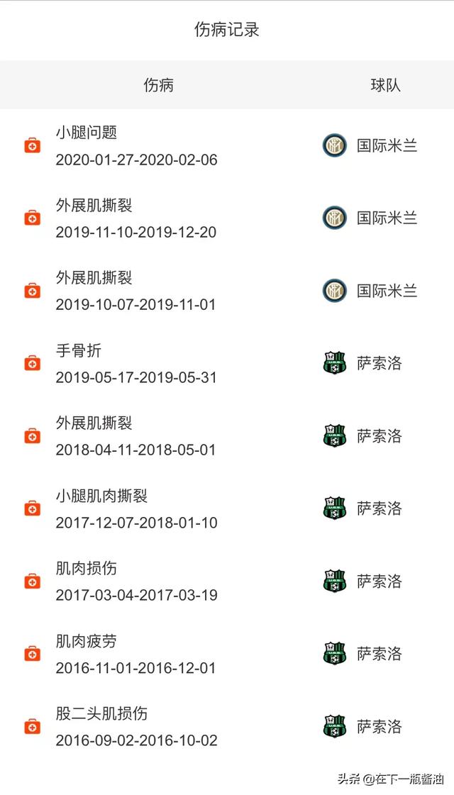 究竟是怎么回事呢?尤其是肌肉经常出问题,有人猜测是不是训练的原因?显然,孔蒂以及平图斯不能背这个锅。我们分析森西的伤病史就会发现在萨索洛阶段,年仅24岁的他也有着冗长伤病史,其中不乏多次的肌肉问题,说明球员本身就是这种体质。