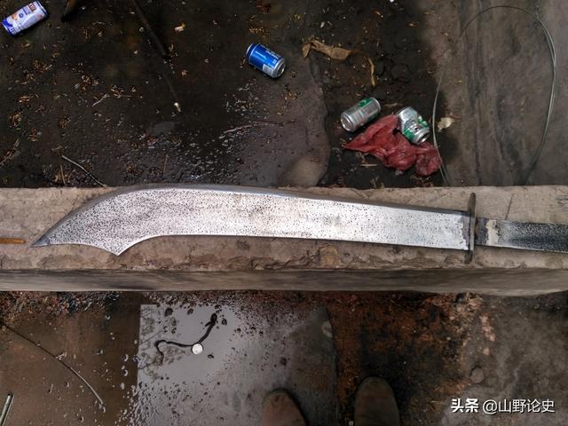我自己打造了一把做工粗糙一点的,直接用轧钢厂轧钢锯片切割出粗坯,然后在细磨。虽然粗糙一点,但是狗腿刀的基本特性有了,自己拿在手里感觉一下,确实有其独特的一面。作为对比,我还打造了一把正曲刀。