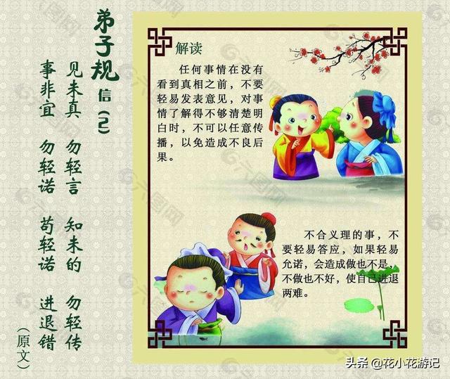 小花从小学会的第一首儿歌就是《弟子规》,这是父亲教会我的。小时候不懂含义,只是朗朗上口,很好背诵,也就很快被了下来。没想到会背诵了以后,就感觉到灾难来了,也就经常恨写《弟子规》的人,觉得古人没事干写这个干吗,害得我这也不能干,那也不能干。