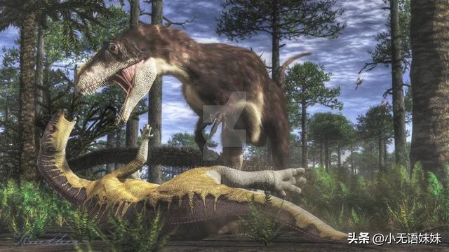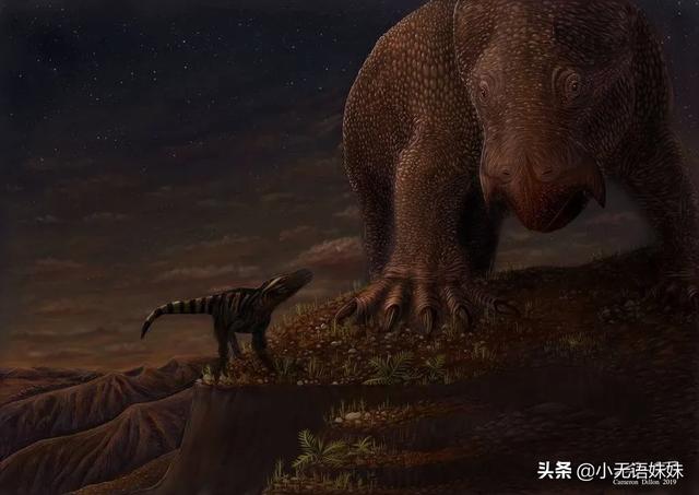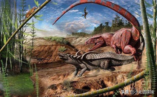 到了三叠纪末,又一次发生了一场大灭绝,地球严重缺氧,而此时的恐龙却演化出了先进的呼吸系统——气囊,可以更高效地促进气体交换,这套系统如今也被鸟类继承。在缺氧的环境下,恐龙更好地适应了环境,快速崛起并且占据了许多生态位,恐龙时代正式来临。一只植龙与恐龙对峙,恐龙在三叠纪依旧是弱小的群体