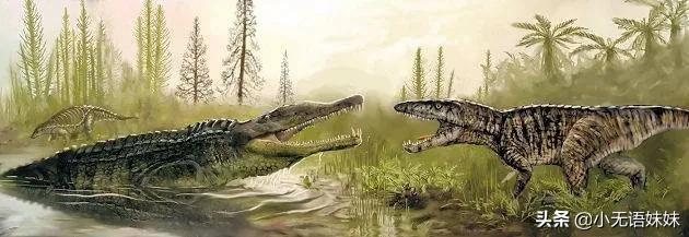 一只波斯特鳄在捕杀链鳄,左上角是一只哺乳形类动物,已经变得十分渺小,而远处一只恐龙形类的动物则在胆怯地看着这一幕。三叠纪时期,恐龙依旧是生态位置边缘的角色