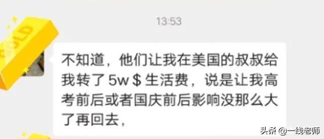 4、“不知道,他们让我在美国的叔叔给我转了5万美元的生活费,说是让我高考前后或者国庆节后影响没那么大了,再回去。”——5万美元就是35万人民币,只是这一笔生活费就高达35万,可能是我们家庭辛辛苦苦工作好几年也未必能攒下这笔钱。