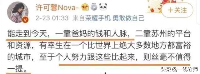 3、“能走到今天,一靠爸妈的钱和人脉,二靠苏州的平台和资源,有幸生在一个比世界上绝大多数地方都富裕的城市,至于个人努力跟这些比起来这丝毫不值得一提。”——那爸妈是干什么的?钱是合法赚来的吗?许可馨的一切,应该都是爸妈靠钱和人脉得来了,那我们没钱没人脉的孩子就没许可馨那么好的命运了。社会真残酷!