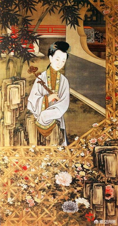 一个美人,手持着如意,站在庭院的回廊之上,她的面前,是一丛盛开的牡丹花。