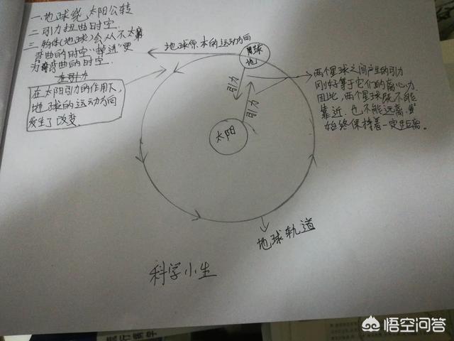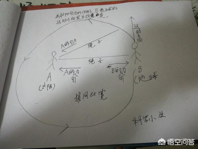 那么根据牛顿的万有引力就可以得知——两个星球之间会产生互相吸引力,两个物体之间的引力大小,跟它们之间的质量乘积成正比,跟它们的距离平方成反比。好了,如果这两个星球分别是太阳和地球,那么太阳和地球之间就会产生相互吸引力并且刚刚好等于它们的‘离心力’,从而导致太阳和地球既不能靠近,又无法远离,彼此始终保持着一定的距离。这就像两个人在拔河比赛一样,A(太阳)拉着B(地球),B(地球)拉着A(太阳),B(地球)本来要做直线运动,但由于A(太阳)的引力更大,导致时空弯曲,而物体会从不弯曲的时空掉入到更加弯曲的时空,所以B(地球)的运动就会发生改变,做弯曲的运动,即绕着太阳运行。在这里有一个离心力,这个离心力是与两个物质之间的引力同时产生的。假如A和B拔河,把绳子拨断了,站不稳的就会往后运动,搞不好会翻跟头。