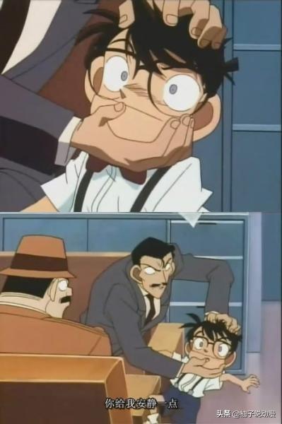 点评:哦呀,毛利老弟你这是要对柯南做什么?你都快把柯南的嘴按成“大力水手”了!