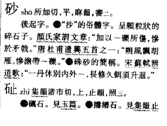 “砂”字也是一个会意兼形声字,从石从少会意,也就是小石粒的意思。它其实是“沙”的后起分化字,只要查一查字典,你就会发现它仅仅拥有一部分“沙”的义项,使用范围要狭窄的多。