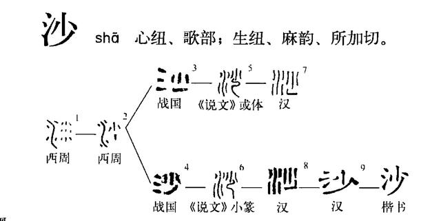 金文则在“小”字的基础上增加了义符“水”,可以将其理解为小水冲刷形成沙粒的意思。后来,篆书将它的形体整齐化,在转化为隶书又发展成楷书后才形成了今天的“沙”字。