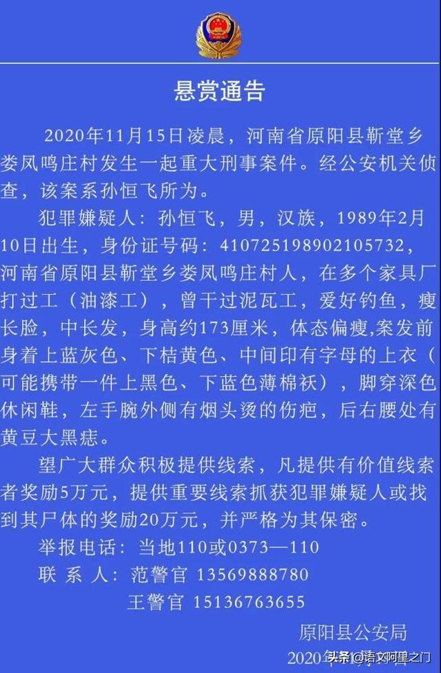 今天,原阳警方发布了新的悬赏通告,和原通告相比,赏金由5万元提升到20万元,增加了孙某飞爱好特点、详细体貌特征,并强调找到尸体也有同等赏金。