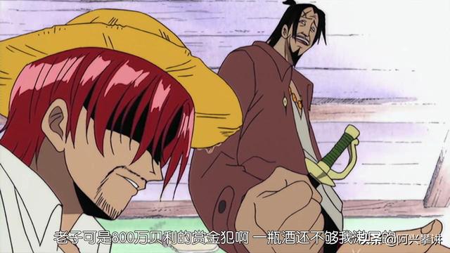 就在这个时候山贼王自爆自己可是悬赏800万的男人。而香克斯就打算帮玛琪诺打扫一下。于是山贼王就将桌上的东西都打翻在香克斯身上,最后还大摇大摆的离开了酒馆,而香克斯以及船员都一笑而过。可是路飞却气的不行,也就是这个时候路飞想要泄愤就将橡胶果实给吃了,就这样成为了橡胶人。
