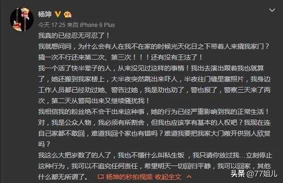 曾经坤微博晒出截图称一女子天天蹲他家门口,蹲了三个月了,还敲门不停的说我喜欢你。 严重影响到明星的私人生活时间,这种病态的追星方式,已经完全失去了自我,分不清虚幻和现实。