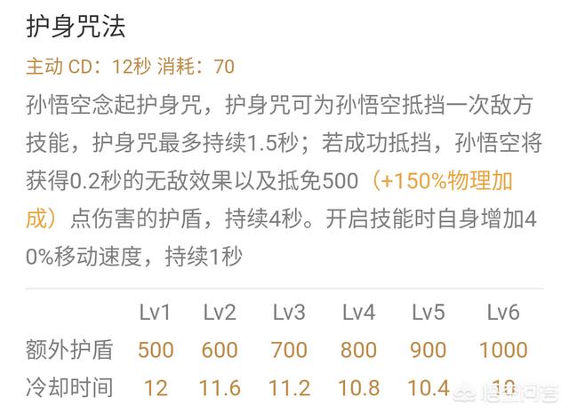 技能初始效果是,开启后1.5秒内会获得一个护身咒和1秒加速效果,期间如果受到敌方技能攻击(注意是技能,普攻不算),会触发0.2秒无敌并获得500 150%物攻值的护盾,护盾持续4秒,技能成长是每次升级增加100点护盾值和减少0.4秒的CD。