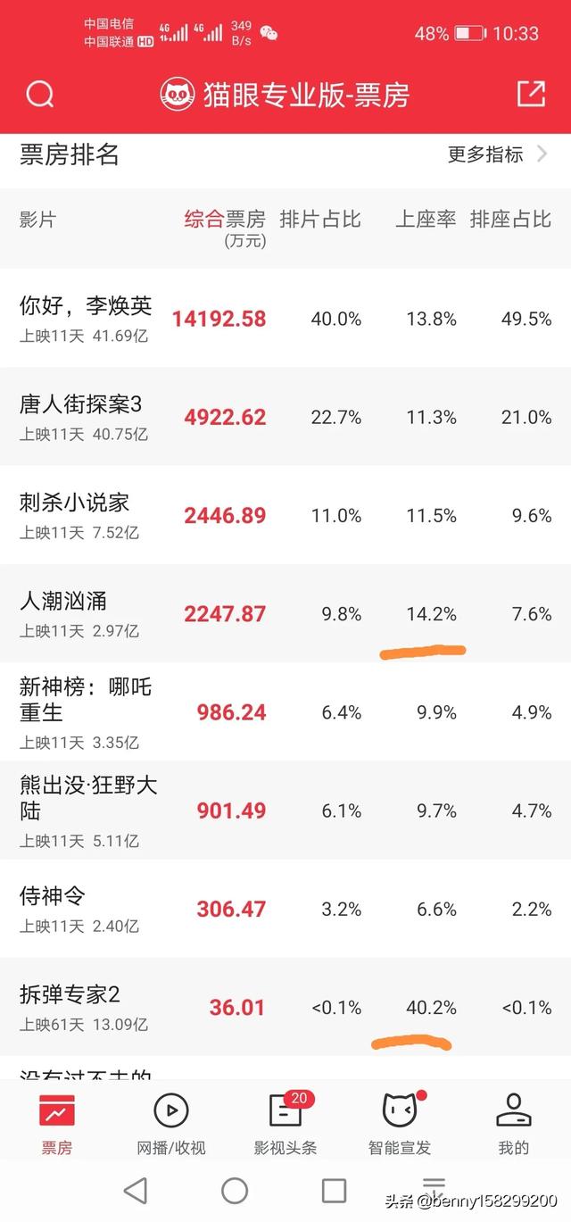 过不过气自己看!二部电影同时在上影!入座率前二名