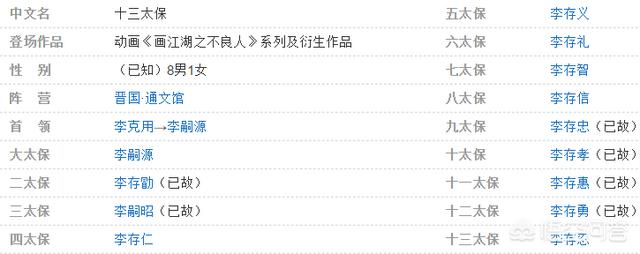 到目前为止,通文馆“十三太保”并没有全部登场,有的“太保”做为后续人物,还不急着出现。不过,我们可以相信,随着玄冥教忙着寻找四大尸祖,不良帅闭关修炼,不安分的李嗣源很可能会有所行动。李嗣源要采取行动,就不得不借助其他“太保”的力量。何况,通文馆刚刚经历一场内耗,引出其他太保不过是再正常不过的事情咯。在“十三太保”中,除了李存勖是李克用的嫡子外,其他人都是李克用的义子。