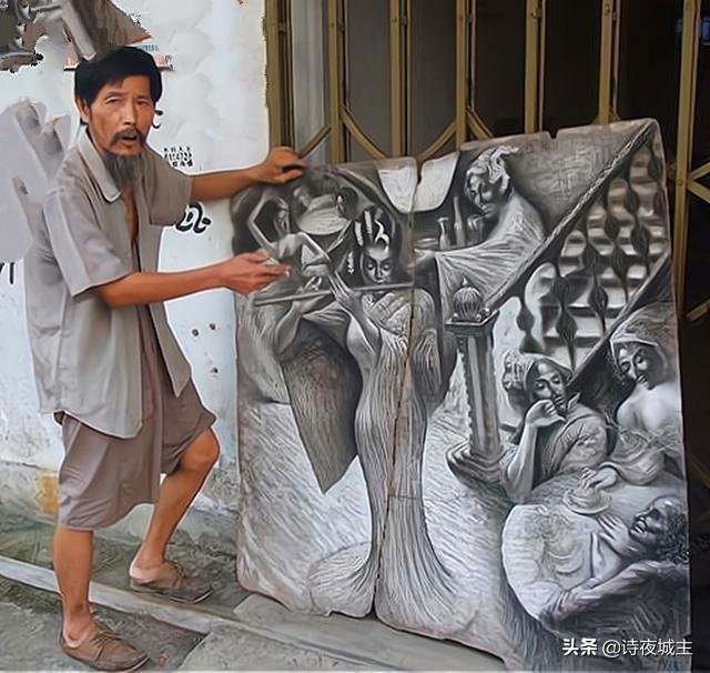 然而,徐荣发画出来的画,比小孩子的“涂鸦”更好看多了,作品人物形象可以辨认,而且人物还有表情,仔细欣赏还是能和人产生情感共鸣的,这说明徐荣发在绘画过程中是有思考的(疯子是不会思考的),只不过,徐荣发的穿着打扮显的另类,邋里邋遢的,看起来像乞丐一样,而且他只用粉笔和木炭画画,所以在正常人眼里,徐荣发的行为就显的“异常另类”了,俗话说,人不可貌相,海水不可斗量,徐荣发的绘画作品形神兼备,线条清晰明朗,