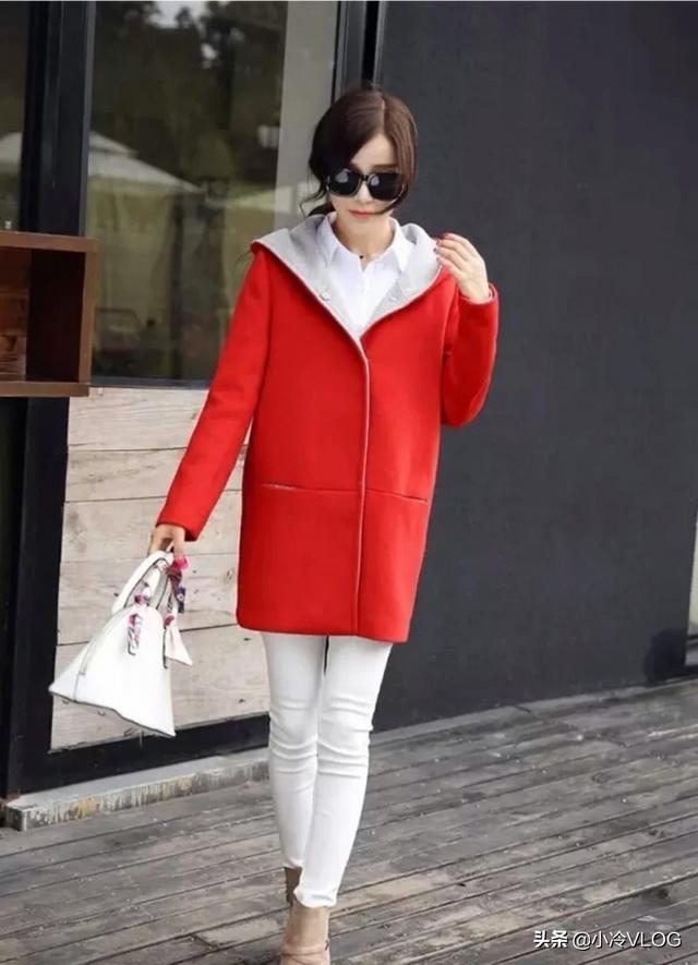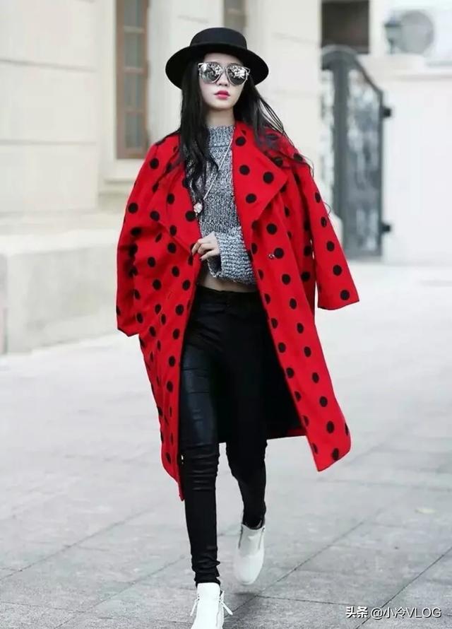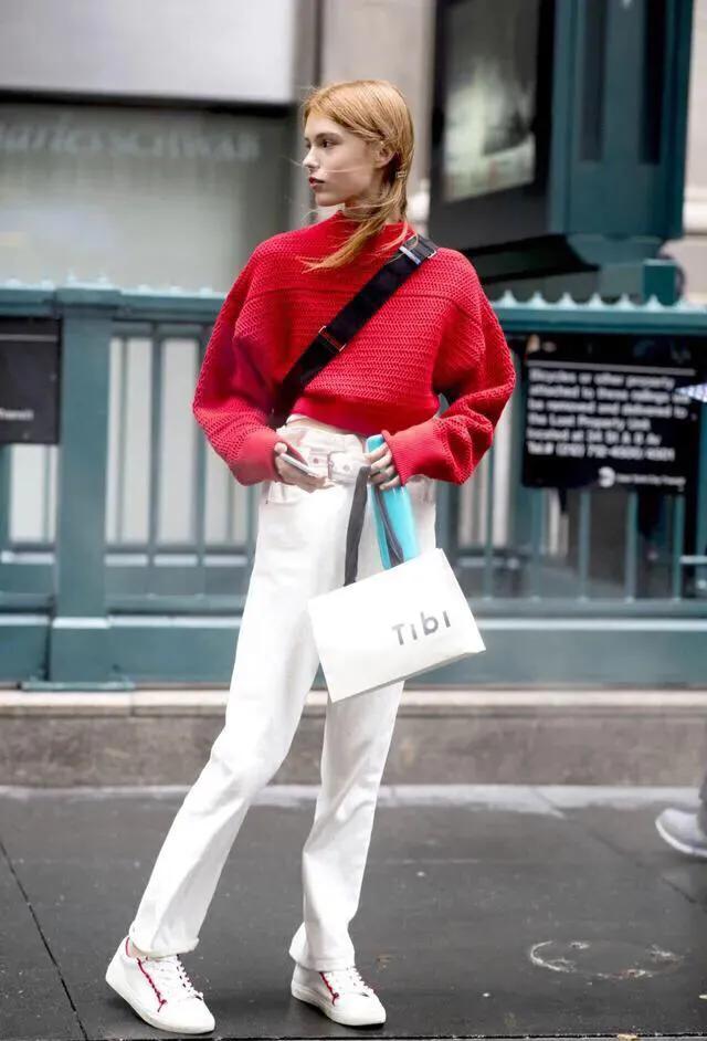 红色上衣配白色、蓝色、黑色直筒裤,廋腿裤显得格外帅气有型。