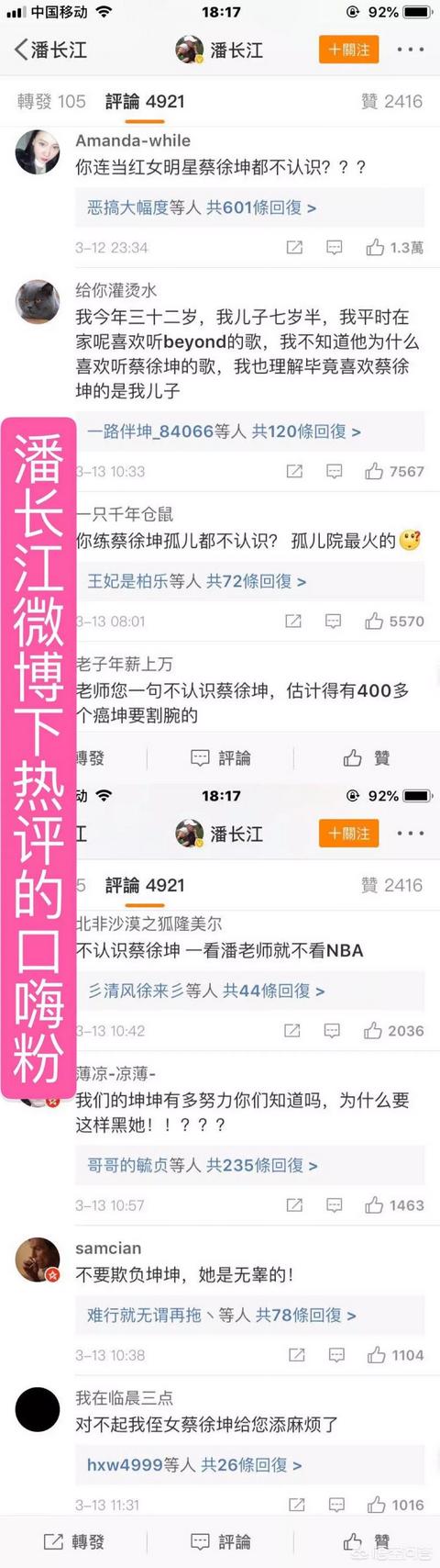 骂潘老师的粉丝呢?微博底下有蔡粉在骂人吗?我寻思智商超过70稍微有点思辨能力的人类都能看出,没真正的粉丝在骂潘老师,相反,几乎全是阴阳怪气辱骂蔡的口嗨流氓在明目张胆的煽阴风点鬼火,挑拨离间。