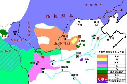 西晋时期的五胡分为几种类型进入中原地区的。西北的羌氐主要就是现在甘肃陕北一带,这些地方本来就是中原王朝的统治地区,本来就是汉朝统治的人民汉化成度很高,离汉族核心区很近,也可以说就是汉族没有华夏化的堂兄弟。随着中原混战人口减少统治力减少他们逐步东迁到了临近的关中陕西一带定居建立了前秦后秦国家。匈奴和羯族被汉朝打败后部分投降了汉朝,被安置在今天山西一带后来逐步南迁到了山西南部定居,也是汉朝臣民结受了一定的汉化。只至于鲜卑族他完全生活在关外的内蒙古草原大兴安岭深山里,野蛮程度最高,也不在中原统治之下 ,后来鲜卑族打败其他北方民族,逐步迁入关内,主要是河北山西一带,最后占据中原建立魏国,迁居河南一带和北方大部分地区。