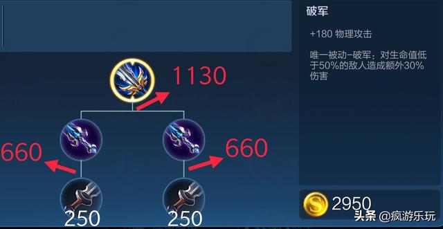 破军合成总金额高达2950金币,而且合成过程非常不平顺,铁剑升级风暴巨剑需要660金币,对于前期还是不少的金币了,而且还需要合成两个暴风巨剑,关键最后一步合需要巨额金币1130,这对于前中期,乃至后期都是很难憋出来的,非常拖节奏。