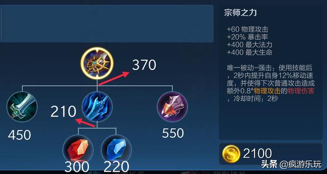 宗师之力合成总金额为2100金币,比破军便宜了850金币,前中期来说这是个非常大优势。而且宗师之力合成过程非常平滑,特别是光辉之剑合成性价比特别高,前期提供不错法力和生命加成,同时还自带唯一被动-强击,这些对于前期对线、清兵、对拼击杀都有巨大的帮助。