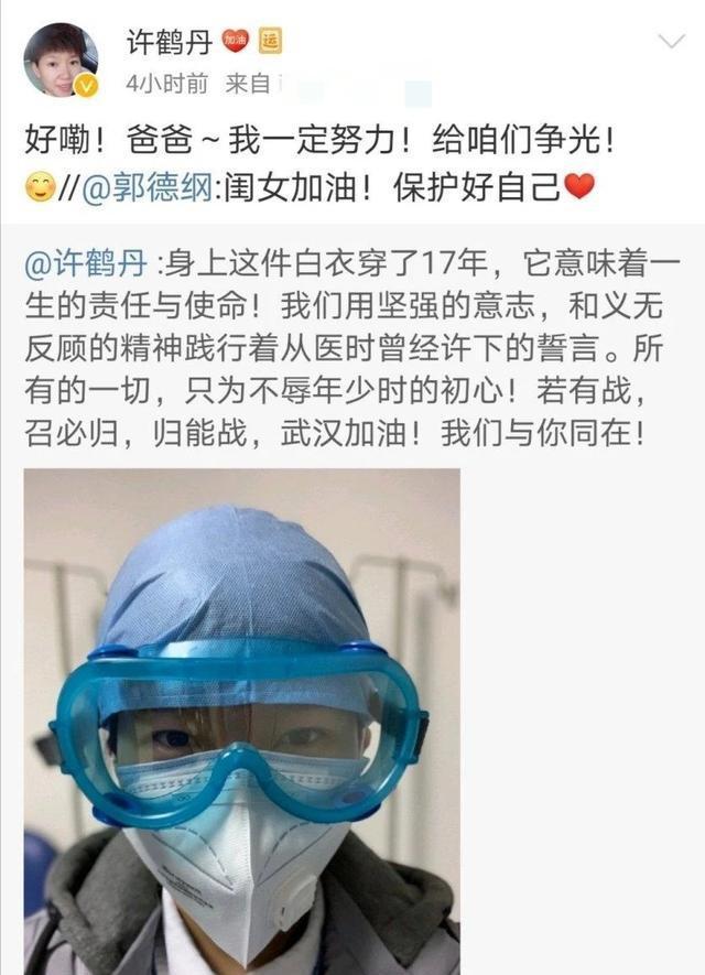 许鹤丹只是把相声当成个爱好,有空就上台与别人唠嗑唠嗑,给别人打打下手等。她的本职是护士,而且十几天前要到疫情第一线去支援,她发表的微博被郭德纲评论:闺女加油!保护好自己。