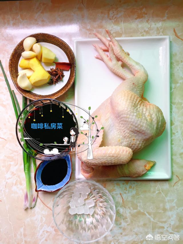 湛江鸡1只,海天生抽大半碗约200克,老抽1汤匙,冰糖12粒,八角3颗,蒜5瓣,生姜1小块,沙姜1大块,小葱2根,桂皮1小块。