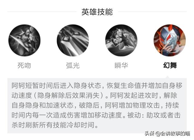 阿轲会短暂的进入隐身,回复自身的生命值并且总价移速。在进攻的时候解除隐身并且增加一定的物理攻击,击杀英雄或者助攻都会刷新大招!是阿轲核心技能。