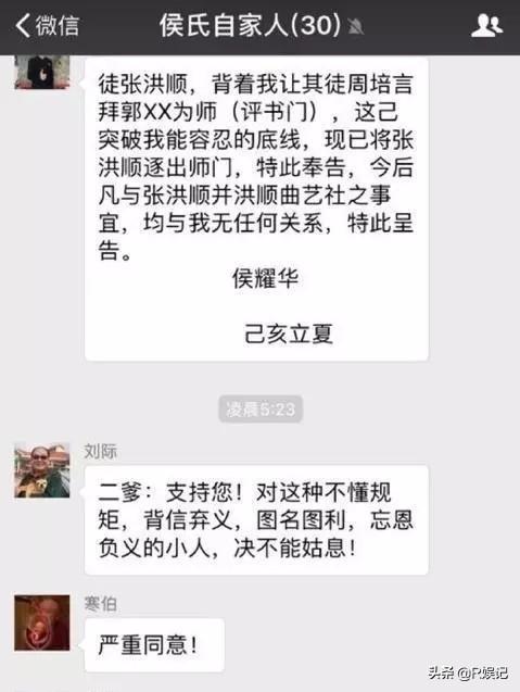 前段时间,周培岩拜郭德纲为师,而周培岩的师父张洪顺是侯耀华的徒弟。侯耀华在群里面公布信息,将张洪顺逐出师门,陈寒柏则在底下附和,表示支持,他就是为了讨侯耀华开心。