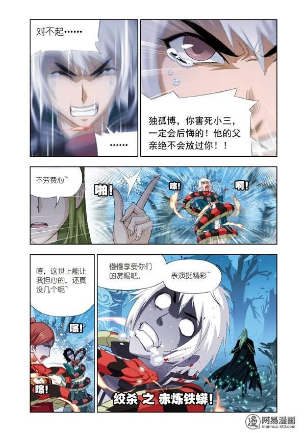 在漫画中,王小刚等人发现唐三不见之后立刻在罗三炮的气味追踪之下找到了唐三,可是却面对了新的危机——独孤博(封号毒斗罗)。双方随机展开激烈的大战,尽管当年的黄金铁三角重组依旧不是其对手。当不得不杀人灭口时,逼得柳二龙都把蓝电霸王龙家族的后台也搬出来了,这里可以清楚的看出独孤博内心的犹豫,这下铁了心要将其处死了。在千钧一发之际,弗兰德说出了唐三父亲的名字,这个名字也是让独孤博为之颤抖,破口大骂其是疯子。(从动漫中的表情来看,吓的不轻)