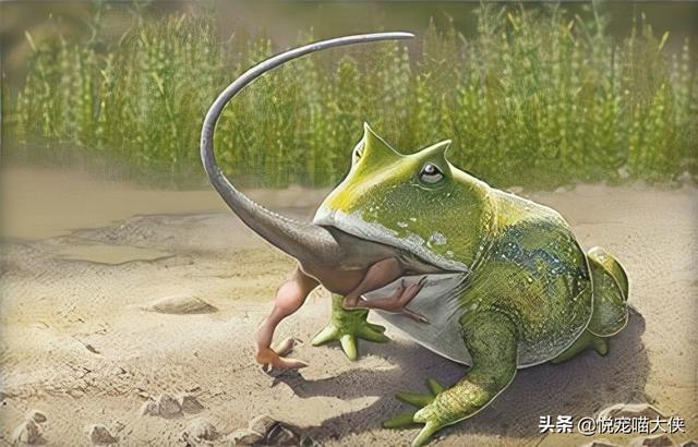 所以说,在石炭纪2亿万年后的白垩纪,蛤蟆的体型也比现代最大的蛤蟆大的多!魔鬼蛙体重有4.5公斤,40cm长,是真正的蛙中之王了!和现代的两栖动物青蛙、蛤蟆不一样,魔鬼蛙既不生活在沼泽、河流等水生环境中,也不会在睡莲叶子上跳来跳去。它们生活在南非的半干旱环境中,会把自己伪装起来,然后突然跳起来捕捉猎物!