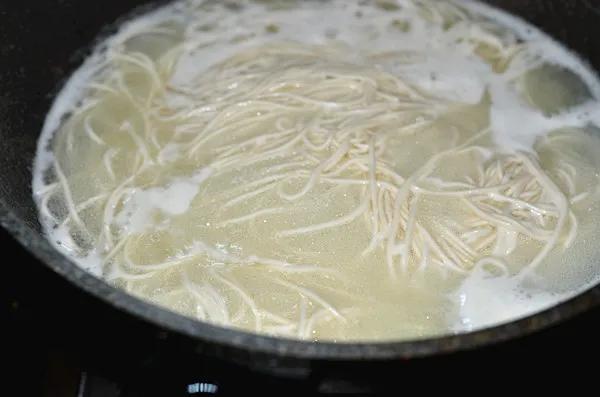 9.锅里放入适量的水,起锅大火烧开放入面条,顺便烫几根小青菜叶