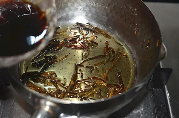 5.持续小火熬到葱段全部变成褐色即可关火