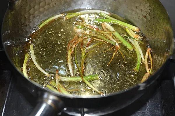 2.起锅热油,锅内倒入适量油先放入葱白,小火慢慢熬