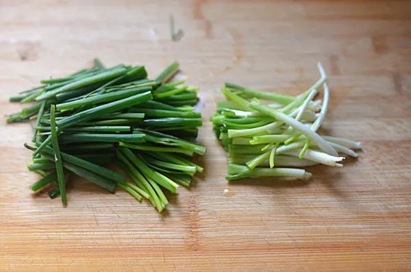 1.小葱去黄叶去根洗净后控干水分,葱白和葱绿的部分切开,切成小段