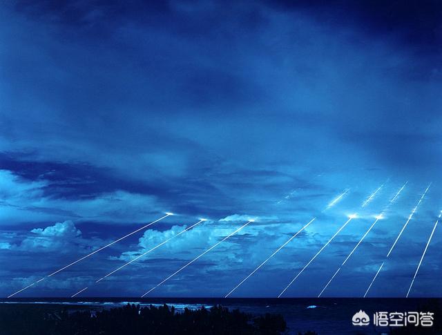 图、美国试射“和平卫士”洲际导弹的多目标重返大气层项目,其中八条亮线代表释放的八个弹头,每个弹头能携带当量相当于25枚在广岛爆炸的小男孩原子弹的氢弹