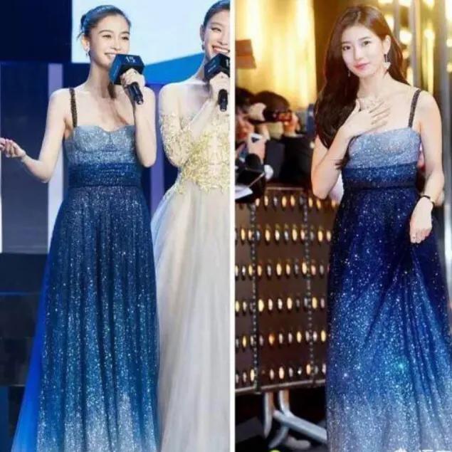 dior蓝色星空裙,两条吊带、高腰而且修身长款。