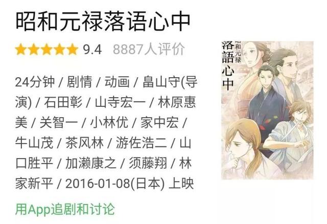 一方舞台,几段落语,道尽世间沧桑。时代脚步匆匆,珍贵的东西在不经意间随之逝去。这部作品用略带悲伤的腔调,讲述了一代艺术家与落语漫长的“殉情”之路。非常有内涵的作品,剧情、人物塑造都堪称完美,声优的演技更是给整部动画增色不少。