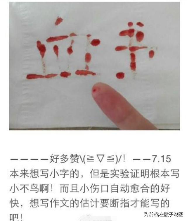 这个问题真有趣!我们再看电视时往往有看到一些“咬破手指写血书”的桥段,比如留下武功秘诀给有缘人,比如写下血书给儿女等等,我们有没有想过这些电视桥段是不是真的可以在现实生活中发生呢?要不大家亲身来试验证实一下。