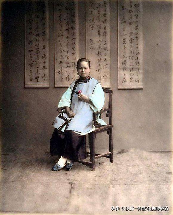 穿直桶旗袍的满洲贵族妇女,头戴菱形方块旗头,脚穿高底旗鞋、