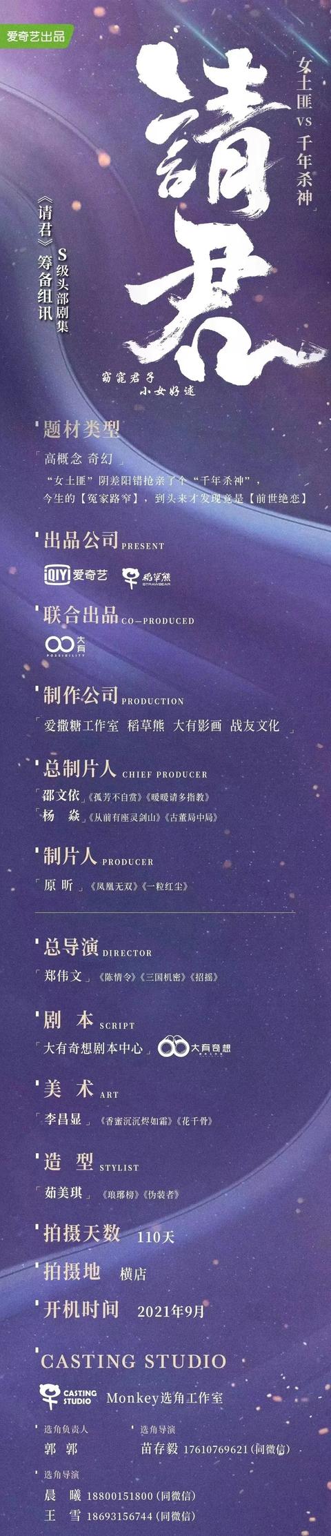 现在在拍的,预计拍摄周期110天的《请君》搭档了李沁出演,是个民国奇幻剧,古装仙侠加民国奇幻,原创剧本,跟小说《请君赐轿》无任何关系,两位都是高颜值,大家可以期待一下啦[送心]