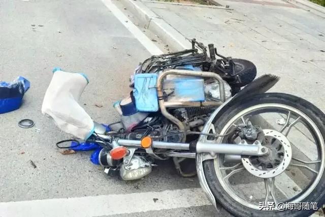 我放下车窗,探头望去,只见一辆蓝色的摩托车摔倒在路上。摩托车的后轮因为惯性的原因依然还转着圈。